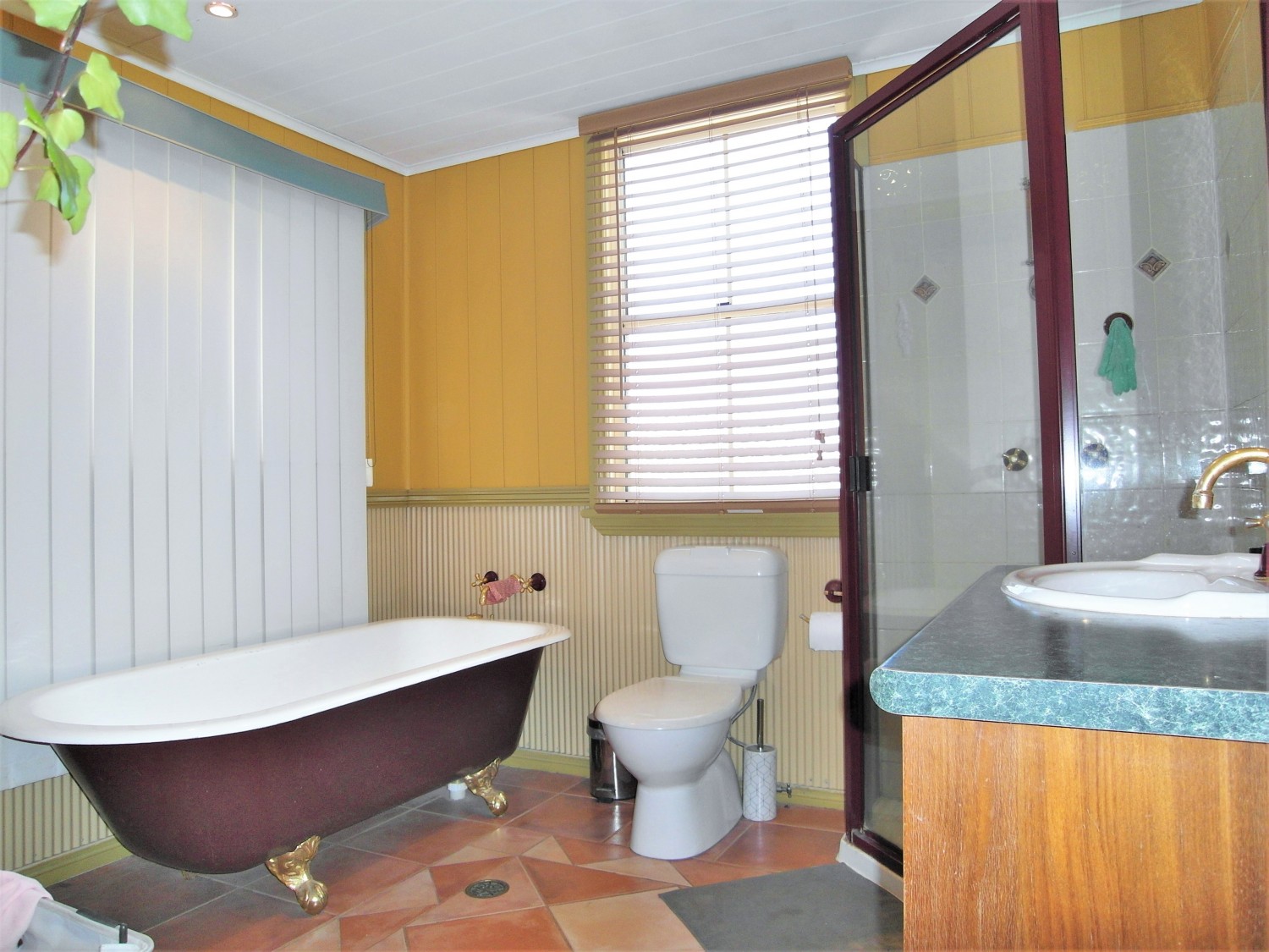 - Massive bathroom with claw foot bathtub and separate corner shower