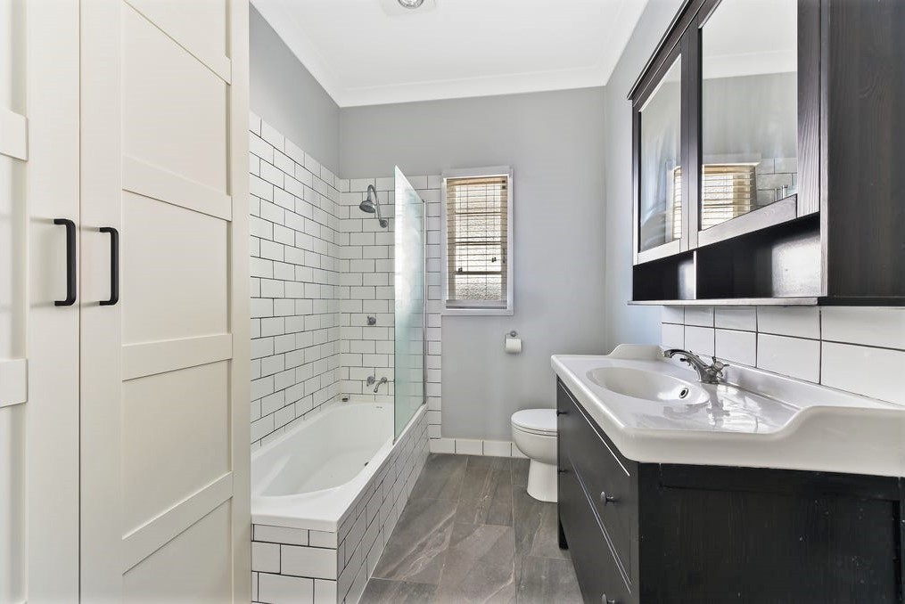 - Stylishly renovated bathroom shower over bath, vanity, toilet and linen cupboard