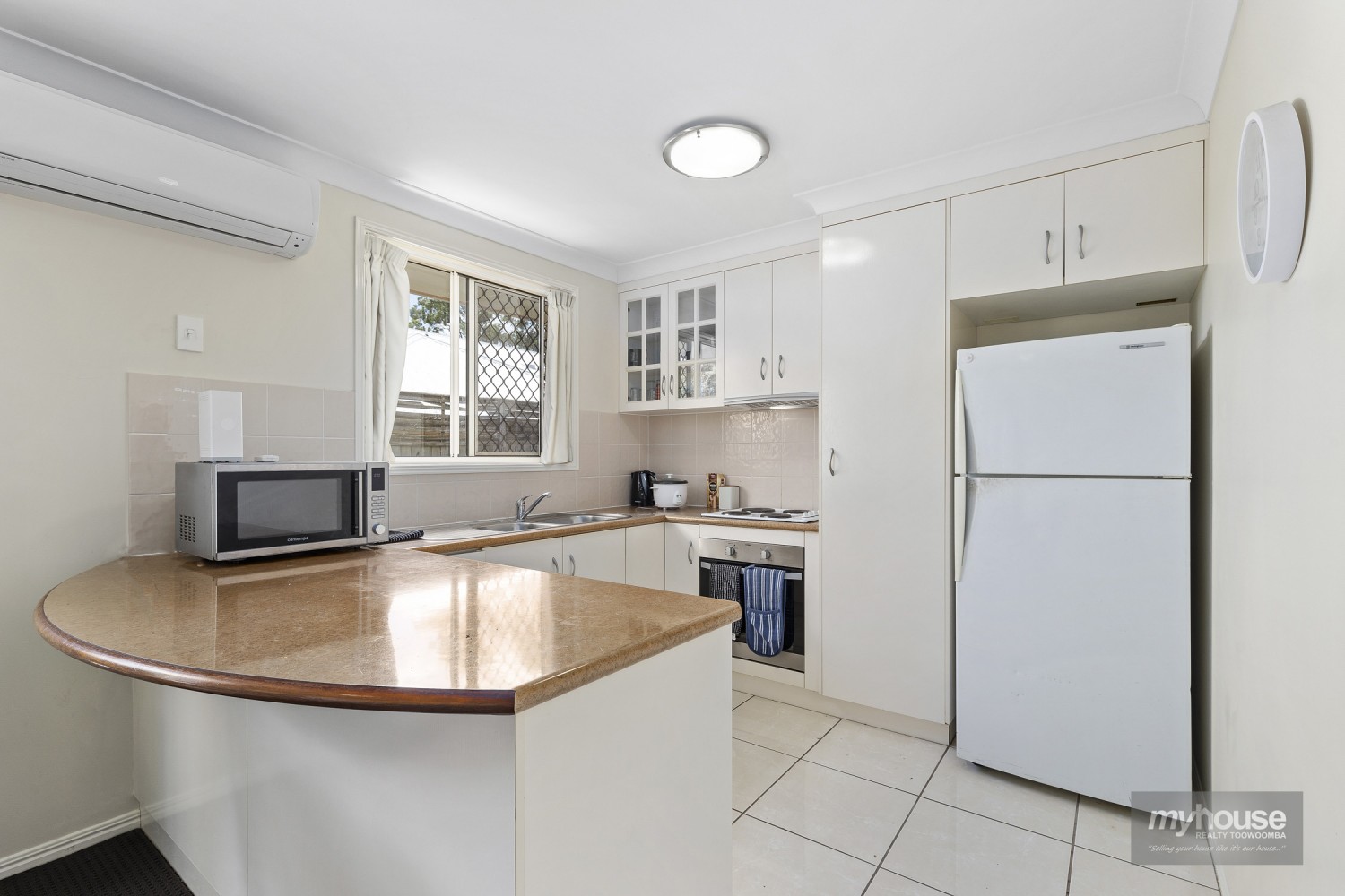 With an air-conditioned lounge and dining room at the rear of the unit that opens directly out onto the generous North facing L-shaped fenced yard (very large yard on the Eastern side of the villa), the spacious kitchen which is immediately off the open plan living space, is equipped with electric oven and cooktop and breakfast bar.