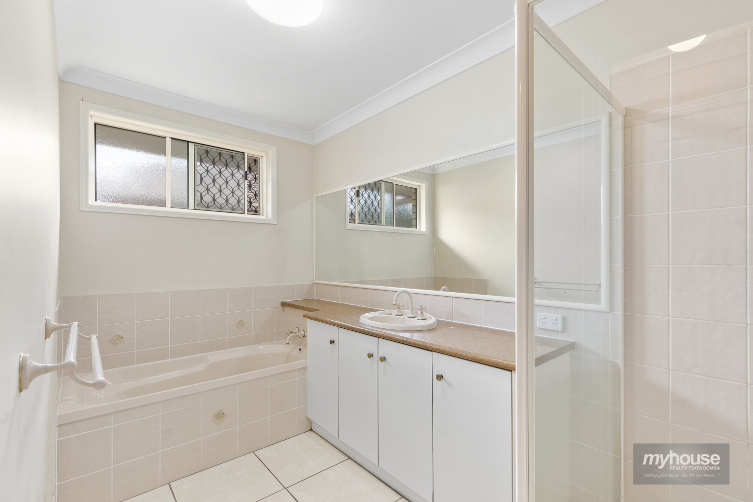 - Main bathroom with shower, bathtub, very large vanity and separate toilet