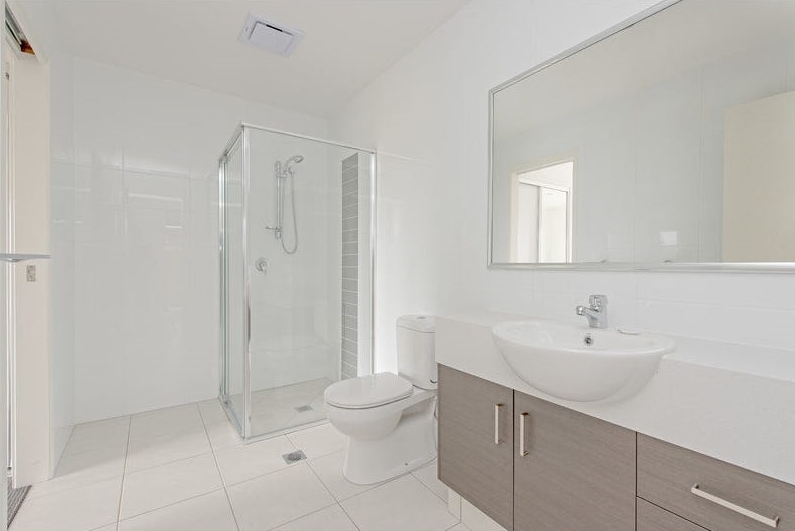 - Spacious bathroom with floor to ceiling tiles and stone benchtop