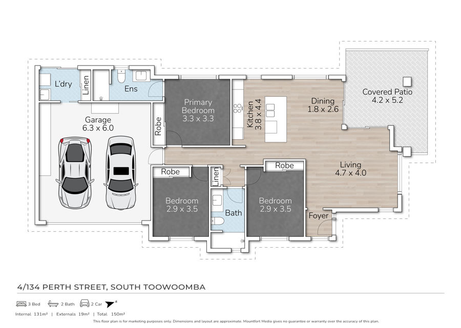 - Three generous bedrooms, all with built-in robes and ceiling fans, main with wall mounted TV