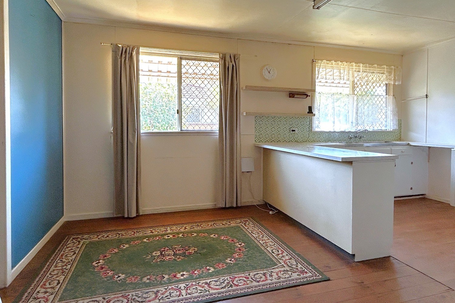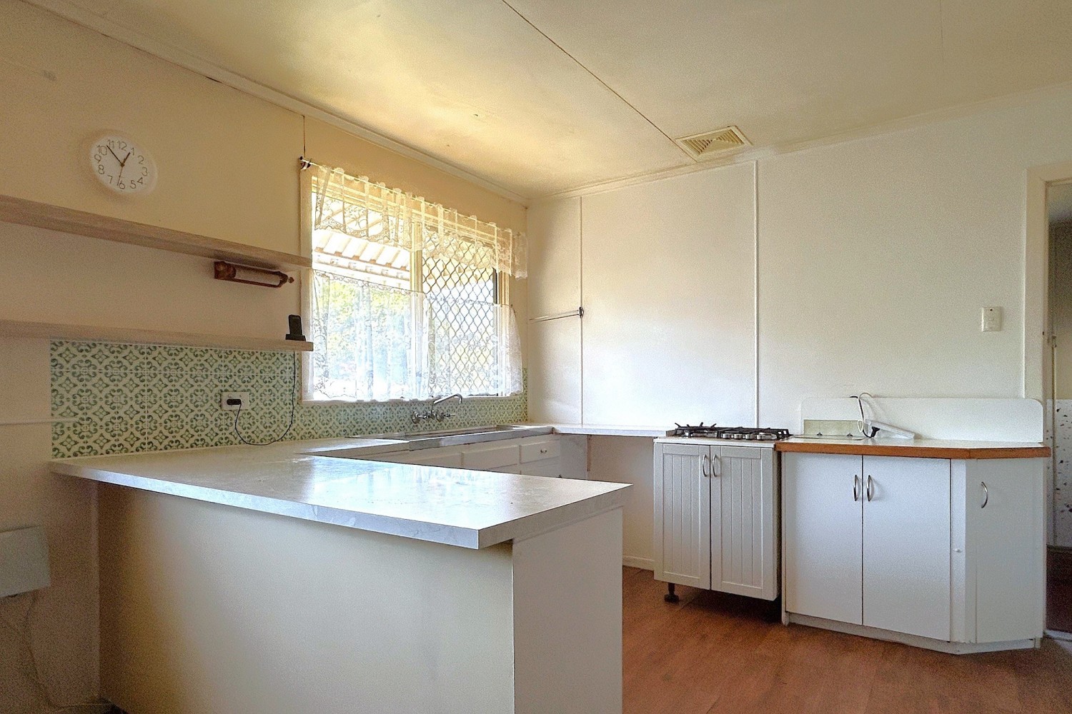 - Functional u-shaped kitchen off dining with single sink and gas cooktop