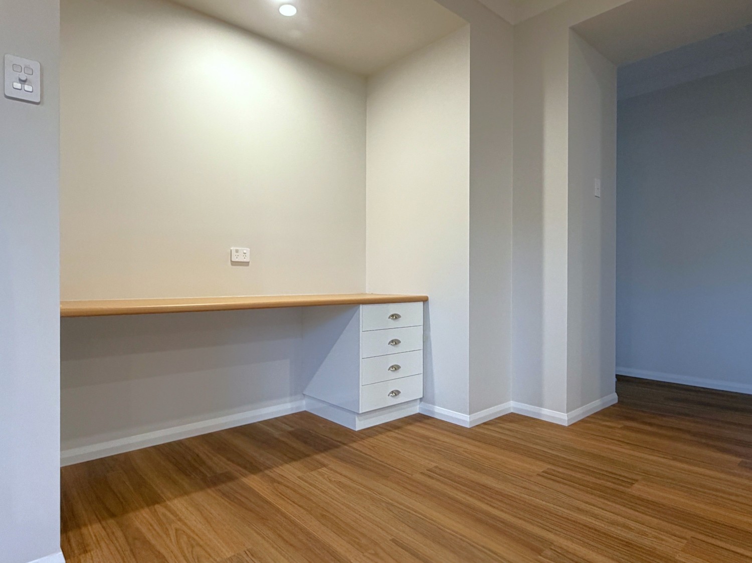 - Handy study nook incorporated into the main living with custom built-in cabinetry