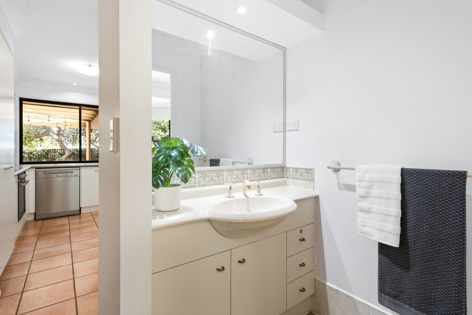 - The galley-style kitchen sits at the heart of the home and comes complete with an electric cooktop, double sink, dishwasher, ample cupboard space and breakfast bar.