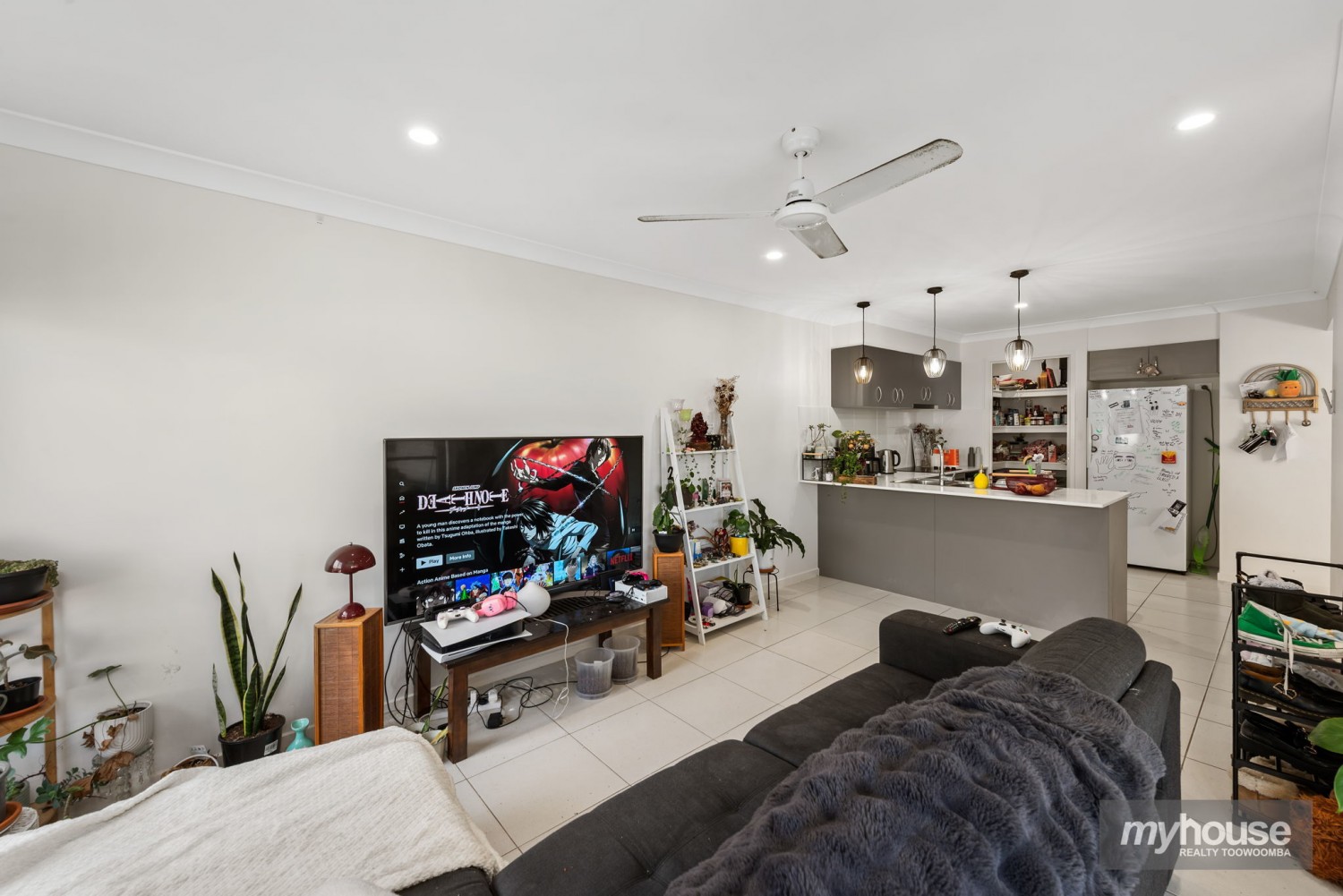 Designed for effortless modern living, the home reveals an air-conditioned open plan living and dining area positioned at the rear for added privacy. This inviting space extends seamlessly to a covered, South-East facing alfresco, ideal for casual entertaining or enjoying quiet outdoor moments. The well-appointed kitchen combines functionality and style, featuring stone benchtops, a breakfast bar, large walk-in pantry, and electric appliances including a dishwasher.