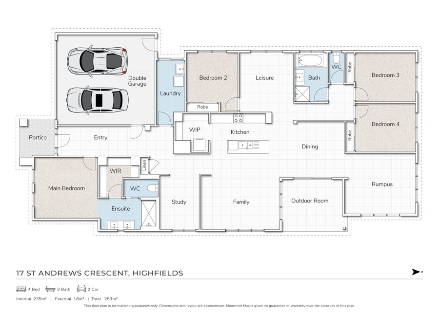 Accommodation is equally impressive, with four spacious, carpeted bedrooms. The private master suite is a true retreat, featuring a walk-in robe and a luxurious ensuite with dual vanities, large shower, and separate toilet. The family bathroom is thoughtfully designed with both a shower and bathtub, plus a separate toilet for added convenience. As a bonus, there is also a large separate study/home office, that with minimal outlay can easily be converted into a fifth bedroom.