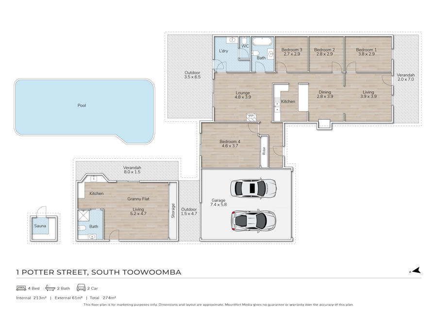 - Detached electric heated sauna room adjacent to the pool behind the granny flat