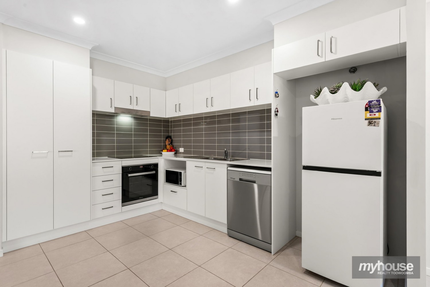 - Kitchen with stone benchtops, and electric appliances including dishwasher